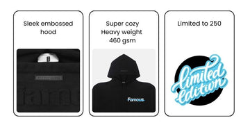 Super cozy heavyweight terry cotton. Embossed hood.